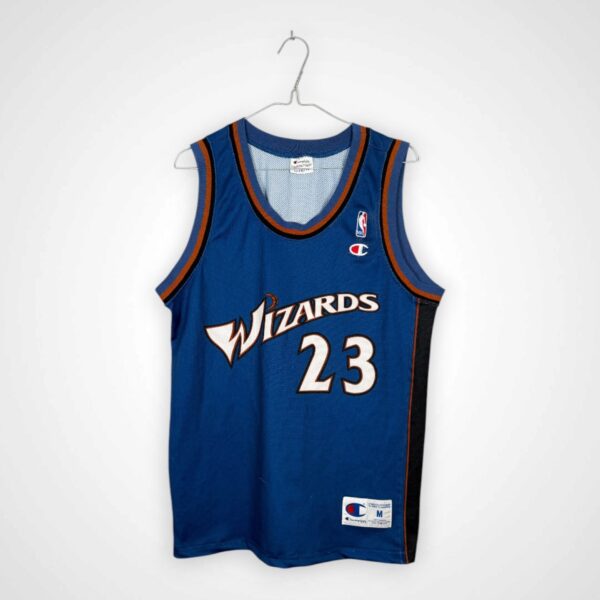 Wyjazdowy model Washington Wizards, wyprodukowany przez Championa w rozmiarze M, stanowi europejską replikę inspirowaną koszulkami używanymi przez klub na początku XXI wieku. Był to wyjątkowy okres w historii Wizards, nierozerwalnie związany z powrotem na parkiety największej legendy światowej koszykówki.