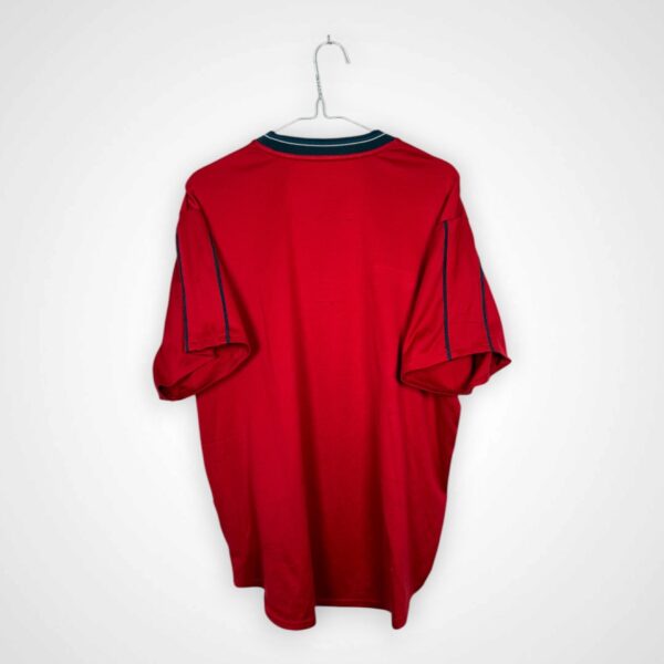 Model reprezentacji Niemiec z lat 1998/00, wyprodukowany przez Adidasa w rozmiarze L, pochodzi z okresu występów kadry na Mistrzostwach Świata 1998 we Francji. Koszulki tego typu wykorzystywane były głównie przez sztab trenerski oraz jako odzież codzienna wokół drużyny, stanowiąc element oficjalnej kolekcji turniejowej.