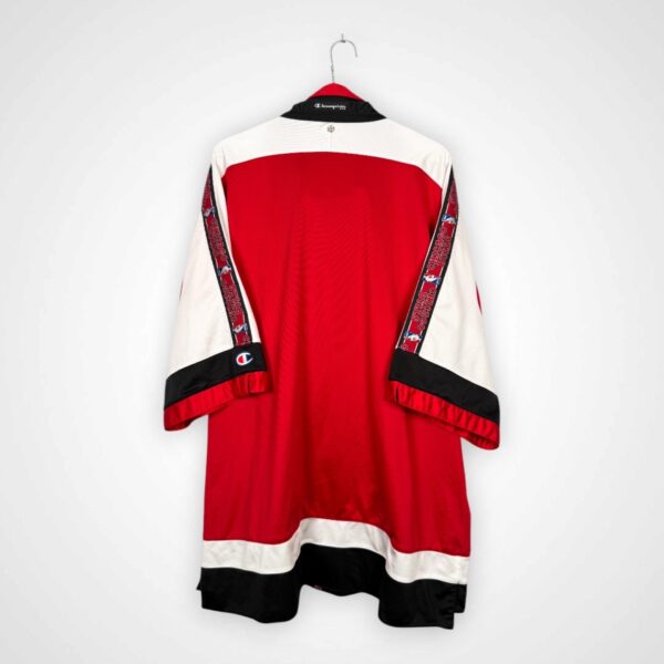 Kurtka została wyprodukowana na czerwonej bazie, a jej charakterystycznym elementem są białe rękawy z lampasami, na których widnieją nazwa Chicago Bulls oraz logo NBA. Całość uzupełniają czarne wykończenia kołnierza i rękawków, a konstrukcja obejmuje zarówno zamek błyskawiczny, jak i guziki, co podkreśla klasyczny, sportowy styl projektów Championa z lat 90.