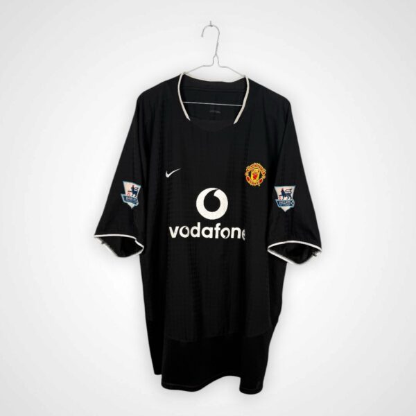 Wyjazdowy model Manchesteru United z lat 2003/05, wyprodukowany przez Nike w rozmiarze XXL, pochodzi z okresu przebudowy zespołu Sir Alexa Fergusona i wprowadzania nowego pokolenia zawodników. Był to czas stopniowego przejścia od drużyny z końcówki lat 90. do młodszego, bardziej dynamicznego składu.