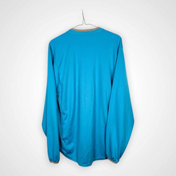 Koszulka została wyprodukowana na błękitnej bazie, a jej charakterystycznym elementem są dwa białe panele umieszczone po bokach na froncie, nadające projektowi dynamiczny wygląd. Na środku znajduje się nadruk sponsora Reg Vardy, wyraźnie kontrastujący z jasnym tłem. Wersja z długim rękawem należy do rzadszych wariantów tego modelu, co dodatkowo podnosi jej kolekcjonerski charakter.
