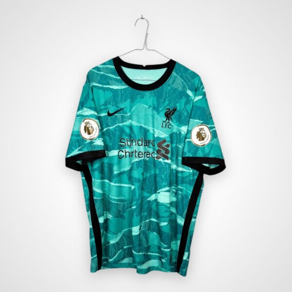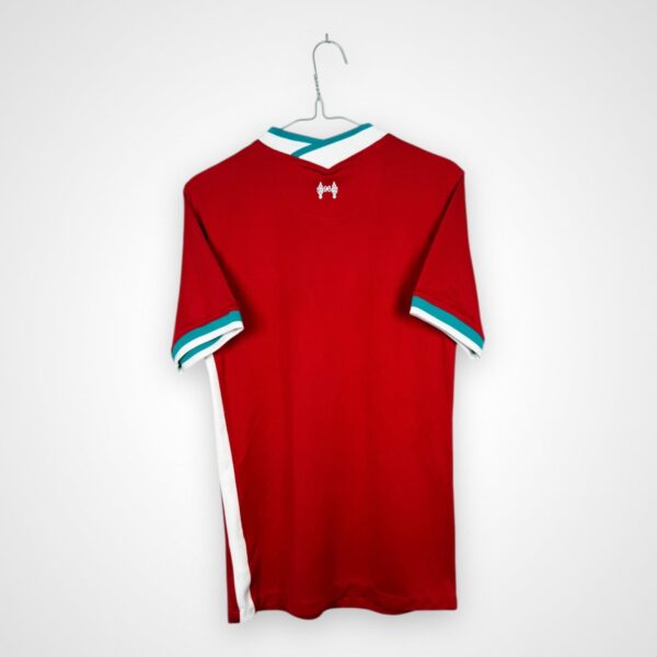 Domowy model Liverpoolu FC z sezonu 2020/21, wyprodukowany przez Nike w rozmiarze S, pochodzi z okresu obrony mistrzostwa Anglii zdobytego rok wcześniej. Drużyna prowadzona przez Jürgena Kloppa mierzyła się z wieloma problemami kadrowymi, szczególnie w defensywie, co wpłynęło na przebieg rozgrywek Premier League, które zakończyła na trzecim miejscu.
