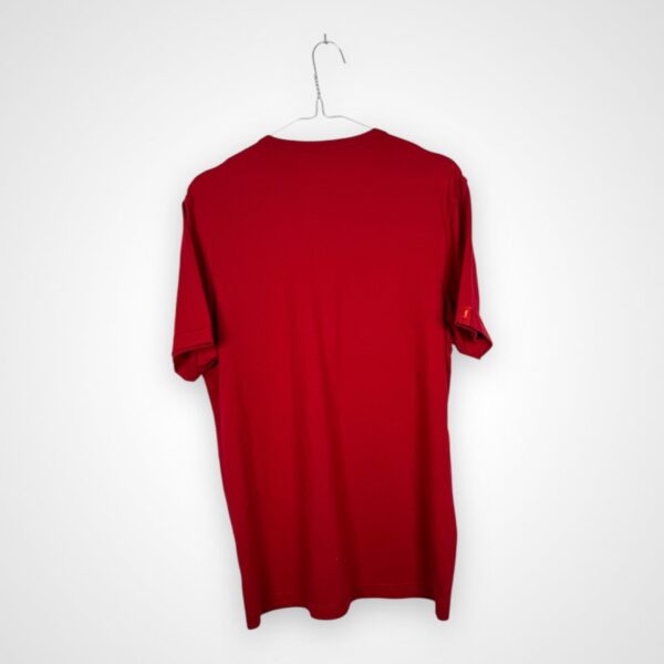 Projekt wyróżnia się kołnierzykiem typu polo, nadającym koszulce klasycznego, niemal retro charakteru. Subtelne białe akcenty w postaci cienkiego paska na kołnierzu oraz detali w okolicach ramion delikatnie przełamują jednolitą czerwień, zachowując przy tym spójność i minimalistyczną estetykę. Na froncie centralnie umieszczono nadruk sponsora Standard Chartered, który czytelnie kontrastuje z ciemną bazą i stanowi stały element tożsamości Liverpoolu tej ery.