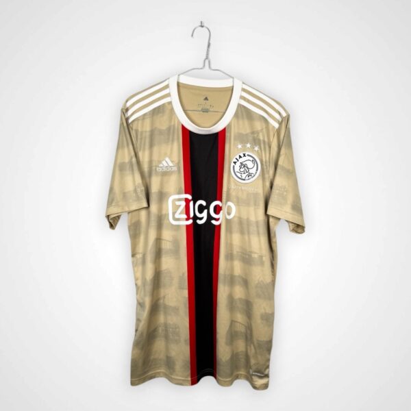 Koszulka została wyprodukowana na złotej bazie, na której widoczne są graficzne motywy nawiązujące do Amsterdamu, nadające całości unikalny charakter. Centralnym elementem frontu jest pionowy czarno-czerwony pas biegnący od góry do dołu, na którym umieszczono nadruk sponsora Ziggo. Projekt łączy nowoczesną estetykę z miejskim stylem, charakterystycznym dla współpracy Adidasa z Daily Paper.