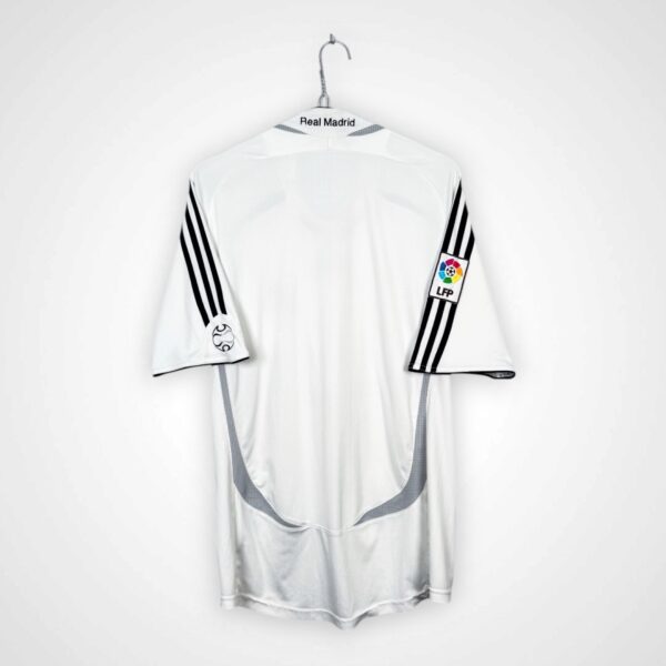Domowy model Realu Madryt z sezonu 2006/07, wyprodukowany przez Adidasa w rozmiarze L, pochodzi z jednego z najbardziej emocjonujących sezonów w historii klubu, zakończonego zdobyciem mistrzostwa Hiszpanii po dramatycznej końcówce rozgrywek. Drużyna prowadzona przez Fabio Capello odrobiła straty punktowe i sięgnęła po tytuł dzięki lepszemu bilansowi bezpośrednich spotkań.