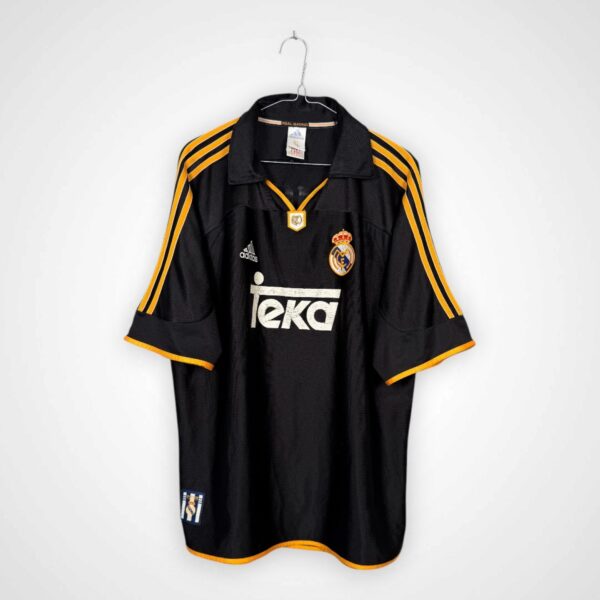 Wyjazdowy model Realu Madryt z sezonu 2000/01, wyprodukowany przez Adidasa w rozmiarze L, pochodzi z początku ery „Galácticos”, zapoczątkowanej głośnym transferem Luísa Figo z FC Barcelony. Był to sezon zakończony zdobyciem mistrzostwa Hiszpanii, a drużyna budowała swoją pozycję jako jednej z najmocniejszych ekip w Europie.