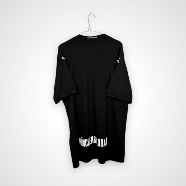 Koszulka została wyprodukowana na czarnej bazie, a jej projekt celowo rezygnuje z tradycyjnego herbu klubowego. Zamiast niego na froncie centralnie umieszczono napis Borussia, ograniczony białymi paskami biegnącymi powyżej i poniżej, natomiast logo Pumy znalazło się nad głównym oznaczeniem. Na całej powierzchni koszulki zastosowano sublimowane herby klubu, widoczne głównie z bliska i tworzące subtelne tło graficzne, a model występuje w wersji bez nadruku sponsora, co dodatkowo podkreśla jego nietypowy, minimalistyczny charakter.