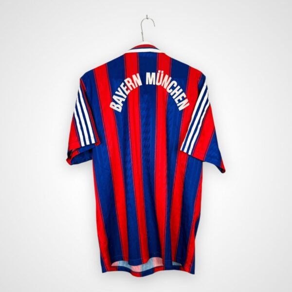 Koszulka została wyprodukowana w charakterystycznym układzie niebiesko-czerwonych pionowych pasów, typowym dla projektów Adidasa z połowy lat 90. Całość uzupełnia biały kołnierz typu polo, który nadaje koszulce klasyczny, elegancki charakter. Na froncie centralne miejsce zajmuje nadruk sponsora Opel, silnie kojarzony z jedną z najbardziej rozpoznawalnych epok w historii Bayernu Monachium, natomiast herb klubu oraz logo Adidasa rozmieszczono tradycyjnie na klatce piersiowej.