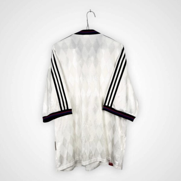 Domowy model Bayernu Monachium z lat 1995/97, wyprodukowany przez Adidasa w rozmiarze M, pochodzi z okresu wyraźnego powrotu klubu do ścisłej europejskiej czołówki. Był to czas, w którym Bayern Monachium ponownie zaznaczał swoją obecność w międzynarodowych rozgrywkach, budując drużynę zdolną do walki o trofea zarówno w Niemczech, jak i na arenie europejskiej.