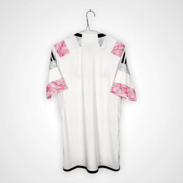 Koszulka została wyprodukowana w układzie poziomych pasów w kolorach białym, szarym i różowym, tworzących nowoczesny i wyróżniający się projekt. Na froncie centralnie umieszczony został nadruk sponsora Jeep, który wyraźnie kontrastuje z jasną kolorystyką koszulki i stanowi kluczowy element kompozycji. Całość wpisuje się w charakterystyczny styl projektów Adidasa.