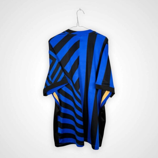 Koszulka została wyprodukowana w nietypowym układzie czarno-niebieskich pasów – w centralnej i prawej części zastosowano klasyczne pionowe pasy, natomiast lewa część wyróżnia się motywem poziomych, co nadaje projektowi nowoczesny i dynamiczny charakter. Herb Interu Mediolan umieszczono centralnie, logo Nike znajduje się po prawej stronie, a całość występuje w wersji bez nadruku sponsora, co podkreśla czysty i minimalistyczny wygląd.