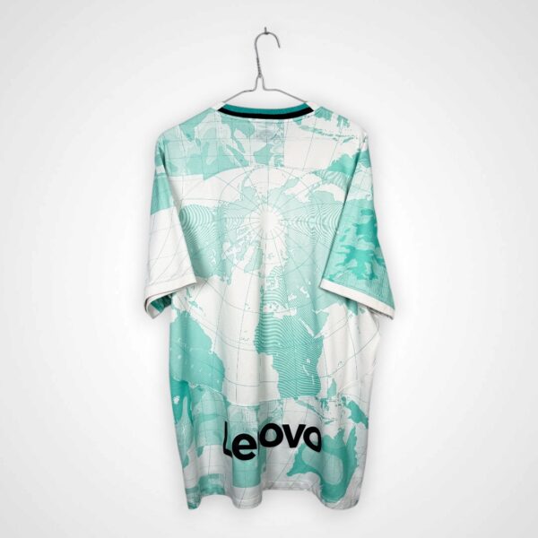 Koszulka została wyprodukowana na białej bazie, z charakterystycznym motywem mapy świata pokrywającym całą powierzchnię w kolorze miętowym, co nadaje projektowi nowoczesny i unikalny wygląd. Na froncie centralne miejsce zajmuje nadruk sponsora DigitalBits, a całość utrzymana jest w stylistyce wyróżniającej projekty Nike z tego okresu.