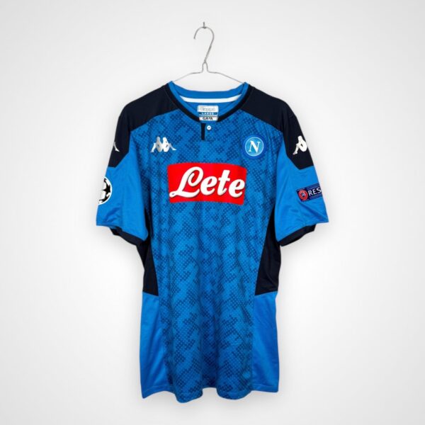 Domowy model SSC Napoli z sezonu 2019/20, wyprodukowany przez Kappę w rozmiarze L, to komplet przeznaczony na rozgrywki europejskie, w których drużyna rywalizowała w Lidze Mistrzów. Był to sezon pełen zmian trenerskich i sportowych wyzwań, jednak neapolitańczycy potrafili zaprezentować się z dobrej strony na arenie międzynarodowej, awansując do fazy pucharowej Champions League.