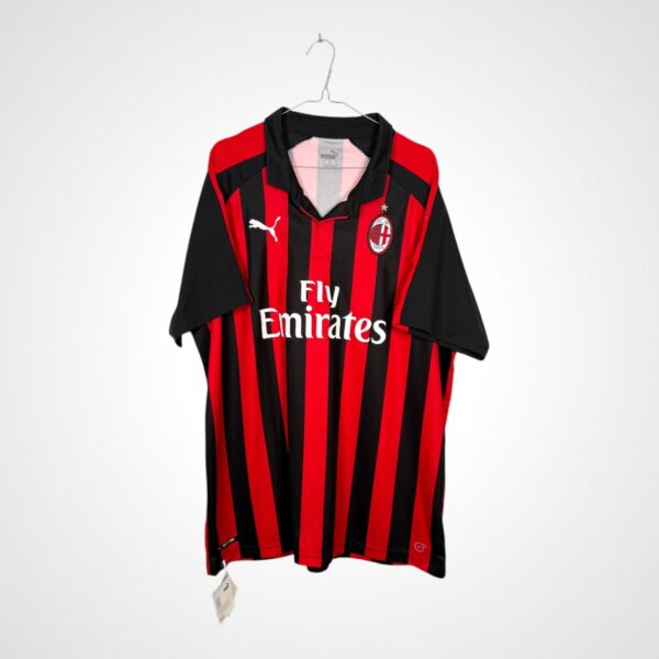 Domowy model AC Milanu z sezonu 2018/19, wyprodukowany przez Pumę w rozmiarze XXL, pochodzi z okresu intensywnej sportowej odbudowy zespołu. Był to sezon, w którym Milan walczył o powrót do europejskiej elity, opierając swoje ambicje na młodszej kadrze oraz świeżych wzmocnieniach, a prezentowany egzemplarz zachowany jest z oryginalnymi metkami sklepowymi, co istotnie podnosi jego wartość kolekcjonerską.