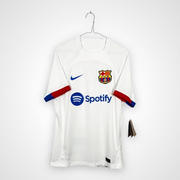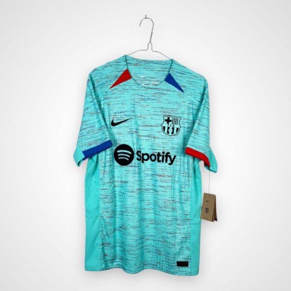 Trzeci komplet FC Barcelony z sezonu 2023/24, wyprodukowany przez Nike w rozmiarze M, pochodzi z okresu kontynuacji projektu sportowego prowadzonego przez Xaviego Hernándeza. Drużyna broniła tytułu mistrza Hiszpanii zdobytego w poprzednim sezonie i pozostawała jednym z najważniejszych zespołów w La Liga, łącząc doświadczonych liderów z młodymi wychowankami akademii La Masia.