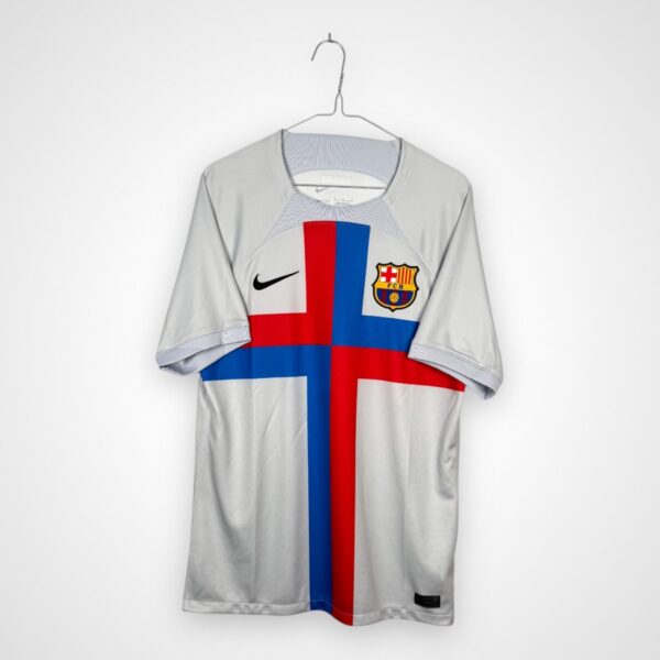 Koszulka została wyprodukowana na szarej bazie, którą przecina duży, wyrazisty krzyż w kolorach niebieskim i czerwonym, nawiązujący do tradycyjnych barw FC Barcelony. Jest to wesja bez nadruku sponsora Spotify, stanowiącego centralny element kompozycji. Herb FC Barcelony oraz logo Nike rozmieszczono klasycznie na klatce piersiowej, zachowując odważny i nowoczesny charakter projektu trzeciego kompletu.