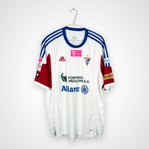 Oryginalna domowa koszulka piłkarska Górnika Zabrze z sezonu 2013/14 produkcji Adidasa z nadrukiem Mateusza Zachary.