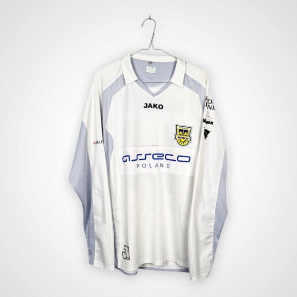 Wyjazdowy model Arki Gdynia z sezonu 2007/08, wyprodukowany przez Jako w rozmiarze M/L, pochodzi z okresu powrotu klubu do Ekstraklasy i walki o utrzymanie na najwyższym poziomie rozgrywkowym. Był to czas budowania zespołu zdolnego do rywalizacji z ligową czołówką, a w składzie pojawiali się zarówno doświadczeni zawodnicy, jak i gracze próbujący odbudować swoją pozycję.