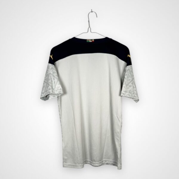 Koszulka została wyprodukowana na szarej bazie z charakterystycznym mozaikowym wzorem widocznym na froncie. Dodatkowe, ciemniejsze panele na rękawkach tworzą kontrast i podkreślają nowoczesny charakter projektu. Całość uzupełniają oznaczenia producenta Pumy, wpisujące się w stylistykę strojów bramkarskich przygotowywanych dla reprezentacji Włoch w tym okresie.