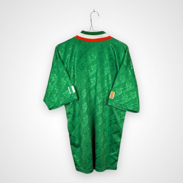 Domowy model reprezentacji Irlandii z sezonu 1994/95, wyprodukowany przez Adidasa w rozmiarze L, pochodzi z okresu jednego z największych sukcesów w historii tej kadry. Lata te bezpośrednio nawiązują do występu Irlandii na Mistrzostwach Świata 1994 w USA, gdzie drużyna ponownie zaznaczyła swoją obecność na światowej scenie po udanym turnieju cztery lata wcześniej.