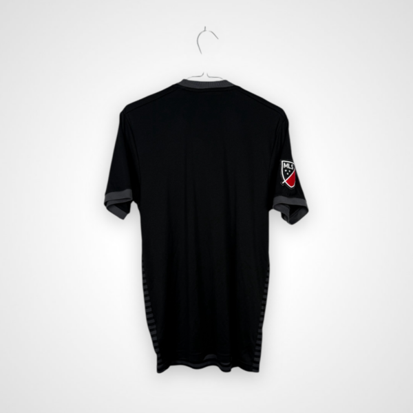Koszulka została wyprodukowana w czarnej kolorystyce, którą przełamują poziome, szare paski na froncie, nadające modelowi wyrazistej struktury i nowoczesnego charakteru. Kołnierzyk wykończono szarym detalem, a na rękawkach zastosowano szare paski Adidasa, co podkreśla równowagę projektu. Na prawym rękawku widnieje patch MLS, akcentujący ligowy status tej wersji. Centralnie na froncie umieszczono nadruk sponsora Leidos w srebrnym kolorze, który kontrastuje z czarnym tłem i pozostaje spójny z metaliczną stylistyką koszulki.