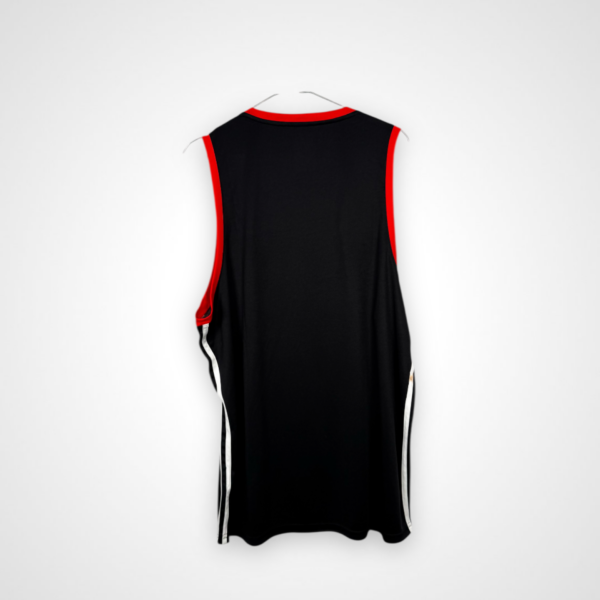 Koszulka została wyprodukowana w formie czarnego bezrękawnika, idealnego do treningu w wyższych temperaturach. Front przełamano grubym, skośnym czerwonym pasem, który stanowi czytelne nawiązanie do tożsamości River Plate i jednocześnie przyciąga uwagę swoją dynamiczną kompozycją. Brak rękawków podkreśla sportowy charakter modelu, a minimalistyczne wykorzystanie kolorów zapewnia nowoczesny, czytelny wygląd typowy dla odzieży treningowej Adidasa z tego okresu.