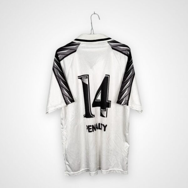 Koszulka została wyprodukowana na białej bazie, z charakterystycznymi czarnymi pasami biegnącymi wzdłuż ramion i rękawków, które nadają projektowi prosty i klasyczny wygląd. Oznaczenia producenta Penalty wpisują się w stylistykę brazylijskich strojów klubowych z przełomu lat 90. i 2000., a całość zachowuje minimalistyczny charakter.